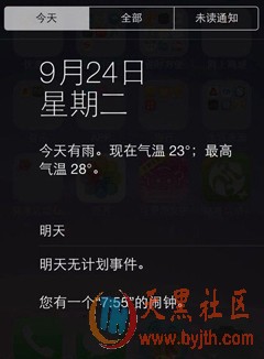 iOS7通知中心变成了“今天”、“全部”和“未读通知”三个分组栏,会显示股票信息、提醒、邮件、未接电话等推送信息。而且更为人性化的一点是,与iOS6相比,iOS 7通知栏的横幅未读通知可以简单消除掉。