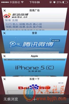 iOS7的Safari浏览器最大的改进就是网页标签页切换功能,而且网页标签以3D卡片显示。