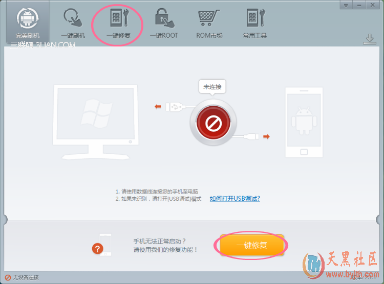 点击页面上方或下方的“一键修复”按钮进入救砖页面。