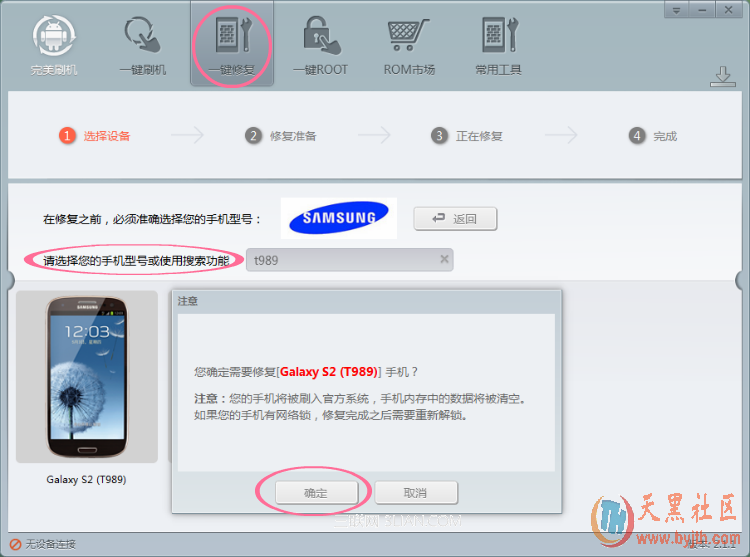 点选机型之后,弹出一个对话框,询问你是否要进行三星t989救砖,选择“确定”。