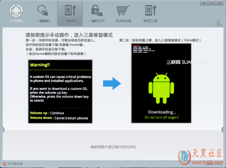 这时软件提示手动进入三星t989救砖修复模式,这几步操作的具体步骤可参照下面的软件截图。