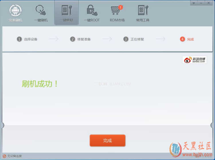 软件运行过程终于结束了,弹出了修复成功页面,三星t989救砖操作还没结束,点击“完成”,同样不用操作手机,等待熟悉的开机画面出现吧,三星t989自动重启成功,爱机重获新生!