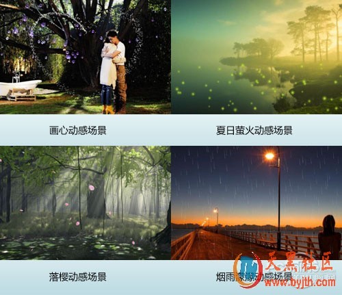如果你想要追求唯美意境,那还可以利用数码大师的动感场景效果,让我们的照片展示具有画心、落樱纷纷、夏日萤火、五彩缤纷、折射泡泡、星光闪耀、叶舞翩跹等动态艺术场景。在软件主界面右下角将“相片展示时间”设置到5秒以上(这样动感场景的展示才足够优雅),在“当相片展示时”弹出框中选择“动感场景”或“双重动态”。当启用“双重动态”时,软件还会在展示动感场景的同时,使照片进行镜头推进和拉远动作,更富动感!