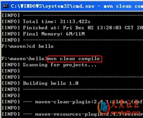在命令提示符下进入到我们的创建的项目目录(F:mavenhello)下,执行:mvn clean compile