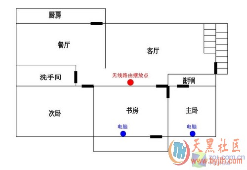 如图所示,书房外墙处是摆放无线路由器的理想位置,这样摆放能够使客厅,书房,主卧,次卧都有一个比较好无线信号。当然,不同家庭结构都不一样,大家应该视具体情况而定。一般来说,无线网卡的客户端都具备信号强度的检测能力,大家拿笔记本在房间各处查看信号强度,从而选择一个最佳的摆放点。另外也可以安装Network Stumbler软件来检测信号的强度。