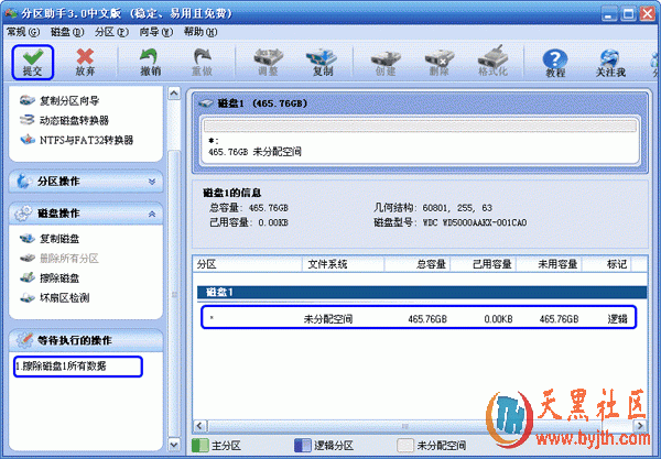 请点击上图工具栏上的“提交”按钮,并在弹出的对话框中点击“执行”来执行真正的彻底擦除磁盘数据这个操作。另外,分区助手不仅可以彻底删除磁盘上的所有数据,同时也可以彻底删除分区(如D盘,E盘)的所有数据,其操作方式与擦除磁盘操作相似。