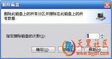 2、然后将打开如下图2所有示的窗口,你可以指定擦除磁盘的次数,最多为100次。擦除的次数越多在执行时所花的时间也将越多。