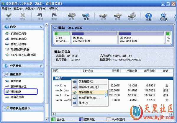 1、下载免费的分区助手,安装并运行。在主界面中的列表框中选择你想擦除的硬盘并右击鼠标,在弹出来的菜单中选择“擦除磁盘”选项。如图1: