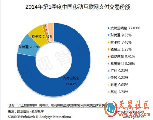 据最新一期的易观《2014年第1季度中国第三方支付市场季度监测》数据显示,2014年1季度中国第三方支付市场移动支付(不包含短信支付)交易额规模达到16317.5亿元,与去年4季度相比增长110.5%。第1季度中国第三方支付业市场格局也发生了较大的变化,但移动支付三大巨头仍是支付宝、财付通和拉卡拉三家公司。只是,与2013年4季度有所不同,财付通已超越拉卡拉上升为第二位,占比9.55%。支付宝与拉卡拉分也别占比77.83%和7.46%,位居第一位和第三位。三巨头稳占全国近95%的市场份额。