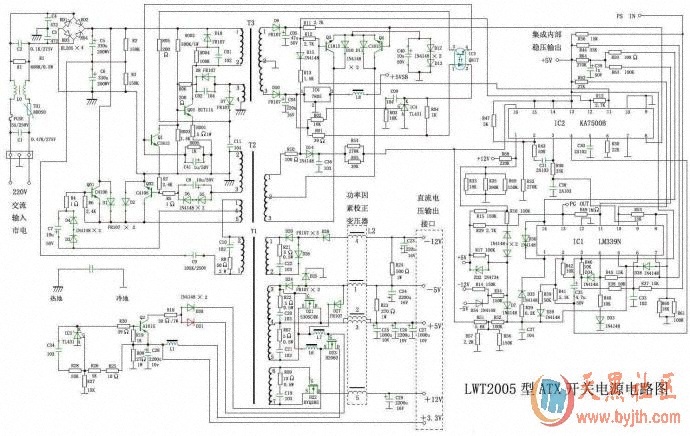这是电源过载或无负载的典型特征。先仔细检查各个元件,重点检查整流二极管、开关管等。经过仔细检查,发现一个整流二极管1N4001的表面已烧黑,而且电路板也给烧黑了。找同型号的二极管换下,用万用表一量果然是击穿的。接上电源,可风扇不转,吱吱声依然。用万用表量+12V输出只有+0.2V,+5V只有0.1V。这说明元件被击穿时电源启动自保护。测量初级和次级开关管,发现初级开关管中有一个已损坏,用相同型号的开关管换上,故障排除,一切正常。