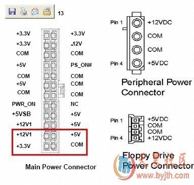 +12V一直以来硬盘、光驱、软驱的主轴电机和寻道电机提供电源,及为ISA插槽提供工作电压和串口设备等电路逻辑信号电平。+12V的电压输出不正常时,常会造成硬盘、光驱、软驱的读盘性能不稳定。当电压偏低时,表现为光驱挑盘严重,硬盘的逻辑坏道增加,经常出现坏道,系统容易死机,无法正常使用。偏高时,光驱的转速过高,容易出现失控现象,较易出现炸盘现象,硬盘表现为失速,飞转。目前,如果+12V供电短缺直接会影响PCI-E显卡性能,并且影响到CPU,直接造成死机。