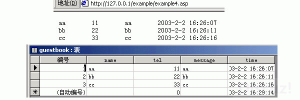 这三句加在前面两句的后面,第一句:设置查询数据库的命令,select后面加的是字段,如果都要查询的话就用*,from后面再加上表的名字,我们前面建立的是不是一个gustbook表阿?第二句:定义一个记录集组件,所有搜索到的记录都放在这里面,第三句是打开这个记录集,exec就是前面定义的查询命令,conn就是前面定义的数据库连接组件,后面参数“1,1”,这是读取,后面讲到修改记录就把参数设置为1,3,好了接下来我们读取记录。