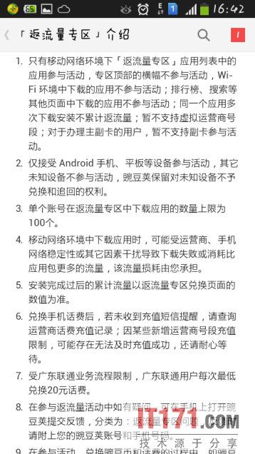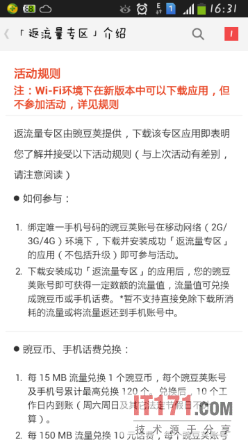 豌豆荚推出的返流量专区活动,以下载软件积累流量值,兑换豌豆币或手机话费。但从用户角度来说,由于使用条款以及规则限制较多,用户参与热情难免受打击。