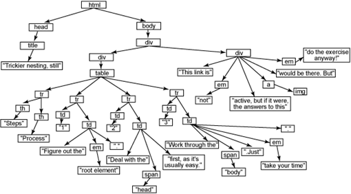 现在,花点时间展开一些 HTML 文档并用树将其勾画出来。尽管这看起来是个不寻常的请求(尤其是在包含极少代码的这样一篇文章中),如果您希望能够操纵这些树,那么需要熟悉它们的结构。