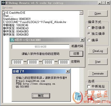 启动E-Debug Events,打开目标程序,输入任意注册码点注册可以见到如下图(如果无法获取按钮事件请在E-Debug Events改变编译方式即可)
