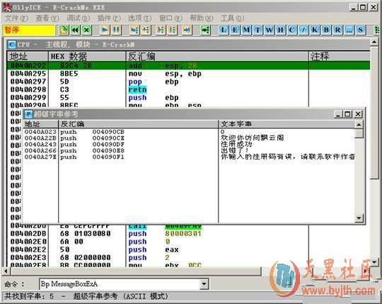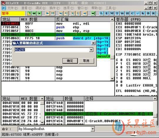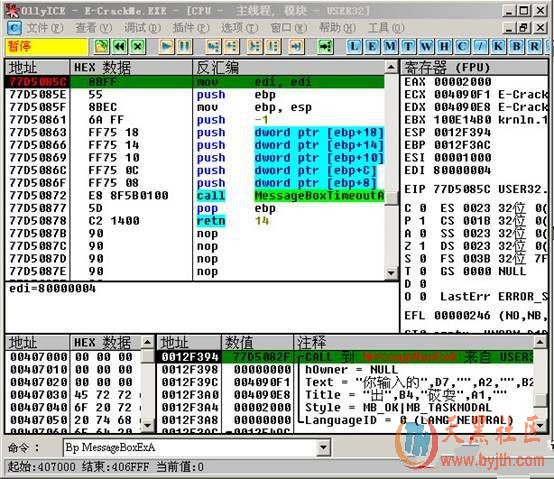 注册对话框API一般为MessageBoxA、MessageBoxW、MessageBoxExA、MessageBoxExW等,命令框输入BP MessageBoxExA中断如下: