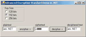 static void Main(string[] args) { byte[] plainText = new byte[] {0x00, 0x11, 0x22, 0x33, 0x44, 0x55, 0x66, 0x77,0x88, 0x99, 0xaa, 0xbb, 0xcc, 0xdd, 0xee, 0xff}; byte[] cipherText = new byte[16]; byte[] decipheredText = new byte[16]; byte[] keyBytes = new byte[] {0x00, 0x01, 0x02, 0x03, 0x04, 0x05, 0x06, 0x07,0x08, 0x09, 0x0a, 0x0b, 0x0c, 0x0d, 0x0e, 0x0f,0x10, 0x11, 0x12, 0x13, 0x14, 0x15, 0x16, 0x17}; Aes a = new Aes(Aes.KeySize.Bits192, keyBytes); Console.WriteLine("/nAdvanced Encryption System Demo in .NET"); Console.WriteLine("/nThe plaintext is: "); DisplayAsBytes(plainText); Console.WriteLine("/nUsing a " + Aes.KeySize.Bits192.ToString() + "-key of: "); DisplayAsBytes(keyBytes); a.Cipher(plainText, cipherText); Console.WriteLine("/nThe resulting ciphertext is: "); DisplayAsBytes(cipherText); a.InvCipher(cipherText, decipheredText); Console.WriteLine("/nAfter deciphering the ciphertext, the result is: "); DisplayAsBytes(decipheredText); Console.WriteLine("/nDone"); Console.ReadLine(); } // Main() static void DisplayAsBytes(byte[] bytes) { for (int i = 0; i < bytes.Length; ++i) { Console.Write(bytes.ToString("x2") + " " ); if (i > 0 && i % 16 == 0) Console.Write("/n"); } Console.WriteLine(""); } // DisplayAsBytes()