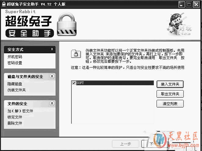 超级兔子是一款常用的系统设置与优化软件。它自带“超级兔子安全助手”,可通过简单的操作,加密重要文件夹。操作步骤如下:启动超级兔子,然后选择“超级兔子安全助手”,然后选择“伪装文件夹”选项。点击右侧的“装入文件夹”按钮,定位到要加密的文件夹(如图1),然后点击“下一步”,待操作自动完成后,退出即可。
