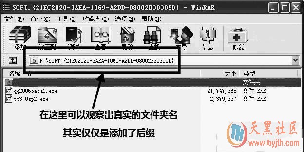 由此可见,其实超级兔子加密仅仅是为文件夹添加了一个后缀名,将其伪装成系统文件夹,而这种方法往往被网上各种加密软件采用,所以笔者提醒各位电脑迷,不要轻易相信所谓的“×××加密金刚”,当你决定购买一款加密软件前,最好先试用一下,看能不能用WinRAR轻易“破解”