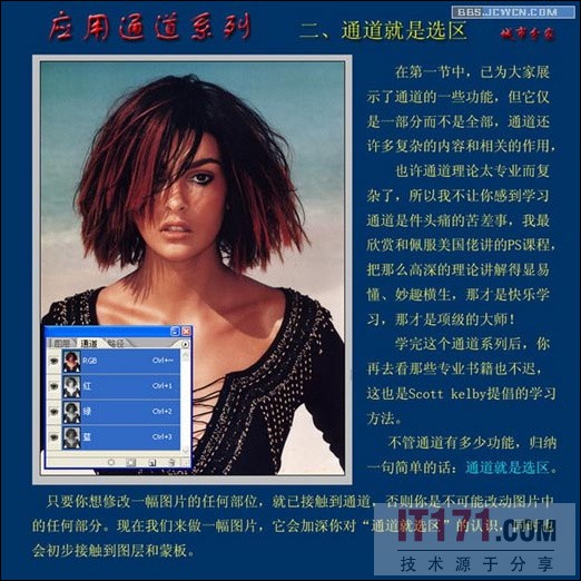 只要你想修改一幅图片的任何部位,就已接触到通道,否则你是不可能改动图片中的任何部分。现在我们来做一幅图片,它会加深你对“通道就是选区”的认识,同时也会初步接触到图层和蒙版。