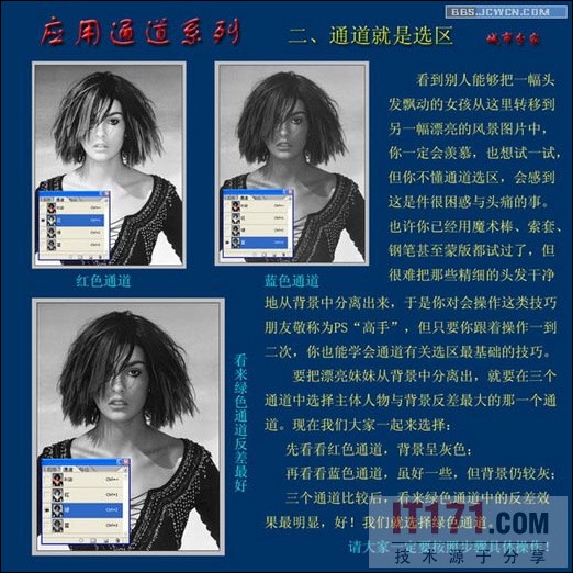 看到别人能把一幅头发飘动的女孩从这里转移到另一幅漂亮的风景图片中,你一定会羡慕,也想试一试,但你不懂通道选区,会感到这是件很困惑与头痛的事。也许你已经用魔术棒、套索、钢笔甚至蒙版都试过了,但很难把那些精致的头发干净地从背景中分离出来,于是你会操作这类技巧朋友敬称为PS“高手”,但只要你跟着操作一到两次,你也就学会通道有关选区最基础的技巧。