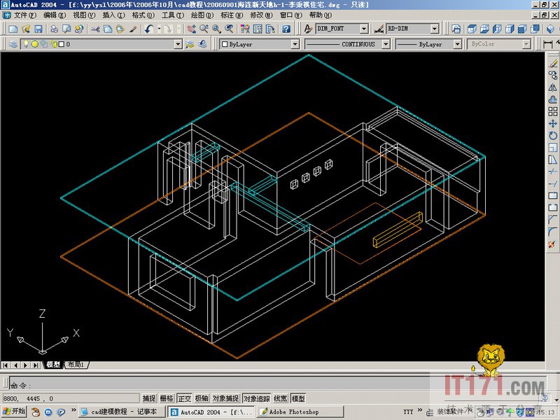 5、依次用ext命令拉伸做好地面[模放在1-地面图层]和平顶[模放在1-吊顶层]。