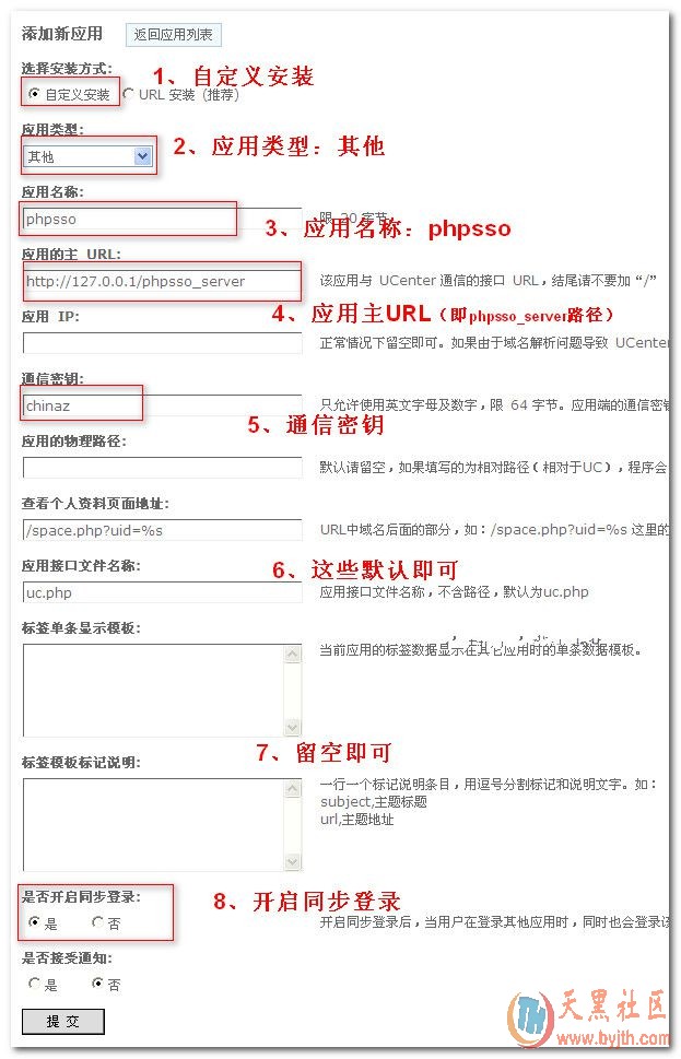 登录Discuz! X2.5后台,进入“UCenter”,点击“应用管理”后点击“添加新应用”进入应用添加界面,设置如下:
