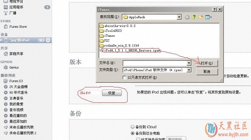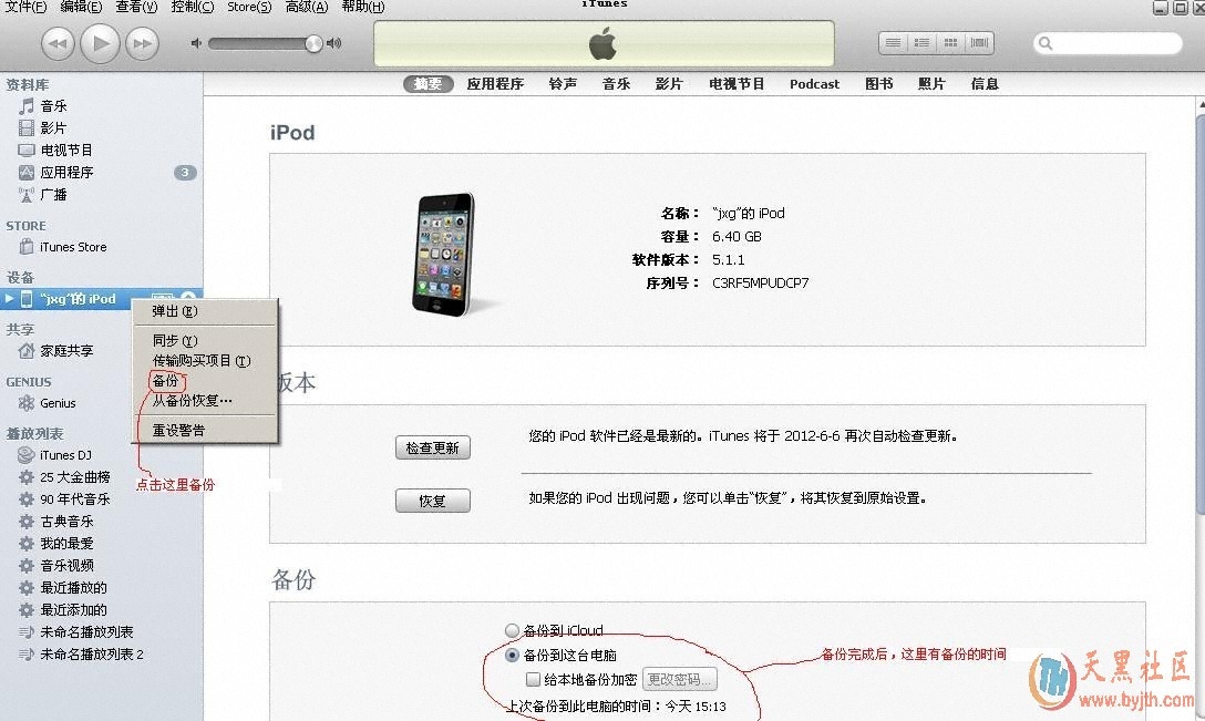 4, 恢复出厂状态:(如果是新机,这一步可以省略)。因为大部分越狱失败者,都是因为没有做恢复操作,终端里面的软件太多,导致了越狱失败。所以最好先恢复一下。首先,用“软件iTunes”备份数据。 ,