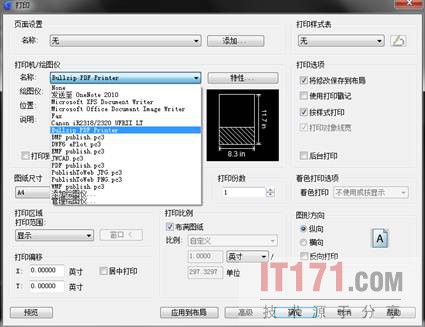 3. 在弹出的打印窗口中,打印机/绘图仪选择“PDF publish.pc3”,则转换为PDF格式;选择“BMP publish.pc3”则转换为BMP图片格式。