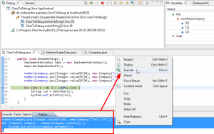 - Display视图 你知道“Display视图”吗?你可以在调试过程中,通过“Window” -> “Show View” -> “Display”来激活它。现在,你的eclipse应该是一个空白的新视图。你可以使用这个视图,输入或者演算一些新的代码。这些代码在当前的调试位置的上下文环境中被执行,这意味着,你可以使用所有变量甚至是内容助手。要执行你的代码的话,只需标记它,并使用右键菜单或者CTRL+U(执行)或者 CTRL+SHIFT+I (检查).