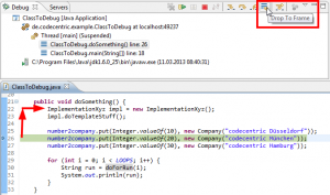 - 导航: Drop to Frame 我想任何人都知道“Step Into”, “Step over”,而且可能也知道“Step return”. 这些是调试时的基本导航功能。我想提两个我非常喜欢的导航的高级方法。第一个是“Drop to Frame”. 使用这个特性你可以及时回退,你可以直接回退到运行过的java堆栈帧中某一帧。当我调试时,一不小心错过了某个关注的代码行时,我常常用这个回退一帧。使用“Drop to Frame”这个特性我可以简单的重新运行某帧代码。