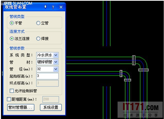 运行“智能水路-双线管”,在绘制窗口中可以设定关于双线管的所有参数,比如管线所属系统的类型、管径、管线标高等信息。