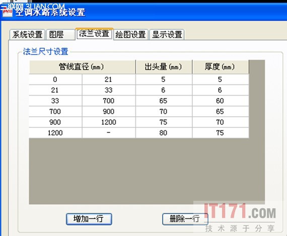 不同管径管线对应的法兰尺寸,可以通过“系统设置-法兰设置”进行个性化定制,如下图所示,用户可以任意修改、增加、删除不同规格的法兰出头量,用以控制法兰图形的样式。