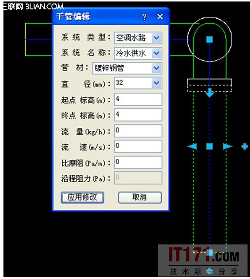 双击管线,可以弹出当前管线编辑窗口,用户可以任意修改管线的尺寸、标高等信息,修改后点击“应用修改”即可完成图形的更新。
