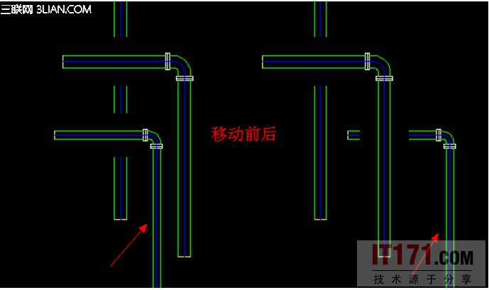 管线位置发生变化,也可以通过CAD的移动操作进行快速更新,不仅可以实现管道图形的移动,管道附属阀门、阀件也可以根据原有的连接关系进行批量更新,如下图。