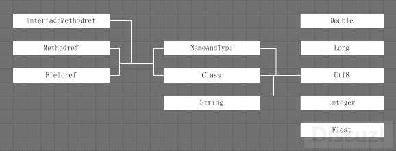 而我们知道,在JVM里面Class都是根据全限定名去找的,那么方法的描述当然也应该如此,那么就得到这些常量之间的关系如下: