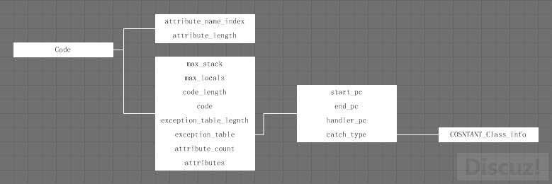 感觉这里的NameIndex和DescriptorIndex加起来和NameAndType有点像,那么为什么不直接用一个NameAndType的索引值表示?MethodInfo和FieldInfo之间最大的不同点就是Attributes。比如FieldInfo的属性表中存放的是变量的初始值,而MethodInfo的属性表中存放的则是字节码。那么我们来依次看这些Attributes,首先是Code: