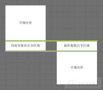 在Class文件编译完成之后,在运行的时候需要多少个局部变量就已经确定(在前面Class文件中也已经看到过了),那么这里需要注意这个特性可能会引发GC(具体如何引发就不在这里细说了)。在栈中,总是底层的栈去调用高层的栈(并且一定的相邻的),那么他们在参数传递(返回结果)的时往往是通过将其压入操作数栈,有些虚拟机为了提高这部分的效率使得相邻栈帧“纠缠”在一起: