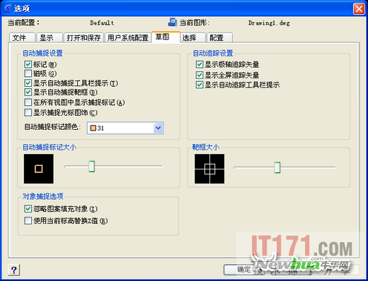 当我们把选项卡切换到【选择】选项上,可以调整拾取框大小以及夹点大小——拾取框为未执行命令时十字光标中心的矩形区域(如图5)。