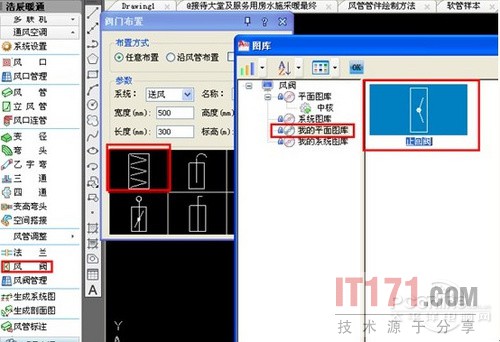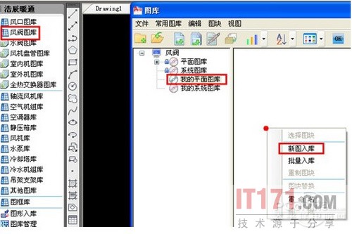 针对特定的项目或特定行业的本地化阀门需求,软件提供了开放的数据库接口,用户可以通过“图库-风阀图库”进行扩充,在CAD绘图区域绘制好需要录入数据库的风阀图形,然后运行该命令,在左侧列表中选择“我的平面图库”,右侧空白区域单击鼠标右键,选择新图入库。