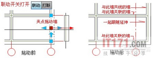 浩辰CAD建筑软件提供了墙体联动修改功能。在建筑设计时,设计师可以打开联动开关,拖动一道墙体,与这道墙体相关的其他墙体会随之延伸,保持原来的连接关系不变,这就避免了设计师依次调整的繁琐,提升了设计的精度。