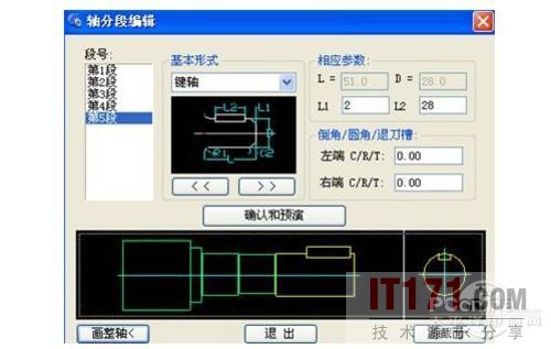 打开浩辰CAD机械软件,找到机械设计中的轴类设计。在弹出的轴分段编辑中选择5段轴进行编辑,输入每段轴的数据,形成我们所需要的轴的大体模型。其中,第5段轴属于键轴。我们需要根据我们绘制的角度选择我们键轴的具体图形(如图2)。