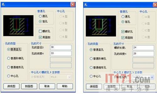 对于这两个孔,可以直接使用浩辰CAD机械软件中的构造工具,构造孔工具来做这两个剖切图。在弹出的孔设置对话框中来设置我们需要的孔的参数。在第一段轴上,我们需要的只是绘制一个简单的局部剖的盲孔。这里的孔的直径是30,深度是33。在第5段上面我们需要的是一个M12,螺纹长24,深度29的螺纹孔(如图4)。