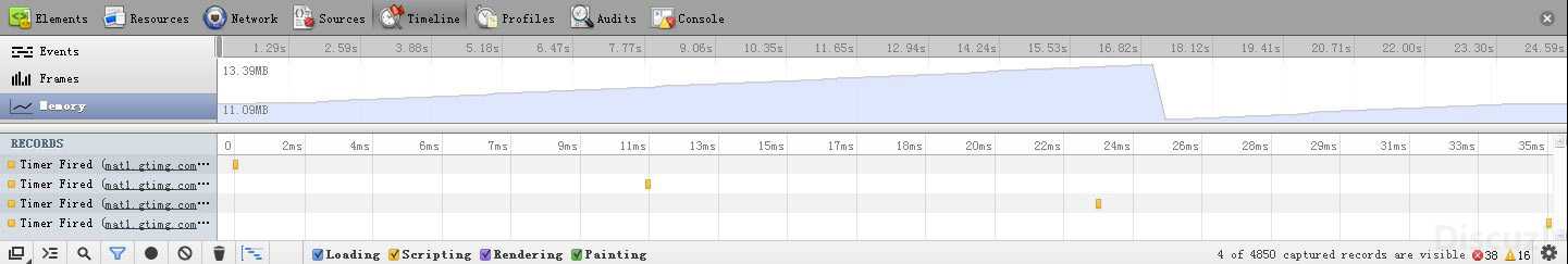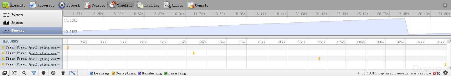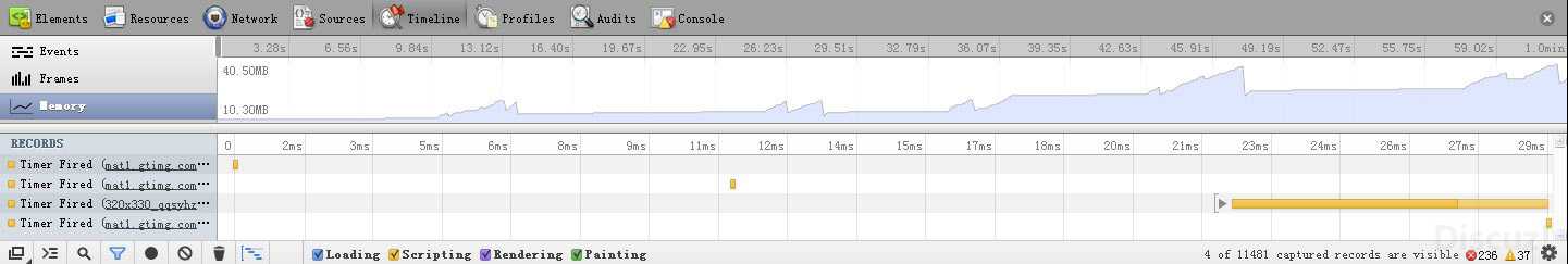 为了给读者一个更确切的分析,于是我对三种方法做了一次蛋疼的性能测试。。。我选择的是拖拽一个页面元素位置的应用场景,为了让性能优化更明显一点,拖拽的是一个iframe,iframe里面加载的是腾讯首页(一般门户网站的首页都够重量级的),这样在拖拽的过程中会不断触发浏览器的重绘。至于怎么看性能,我打开的是chrome的调试面板的时间线标签,里面有memory监视。对于性能的评价标准,我选的是内存占用。