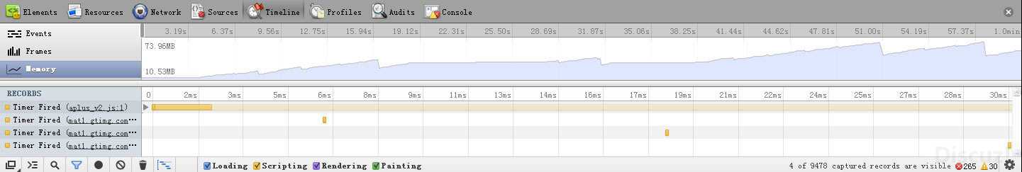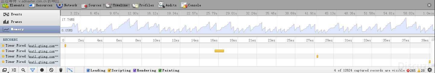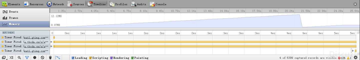 为什么第三种方法会比第二种方法占用内存更小呢?个人认为,这跟内存回收有关,有可能chrmoe在这方面真的优化得太多(。。。)。不断地每隔一个小时间段地新建定时器,使得内存一直得不到释放。而使用第三种方法,从代码结构可以看出,