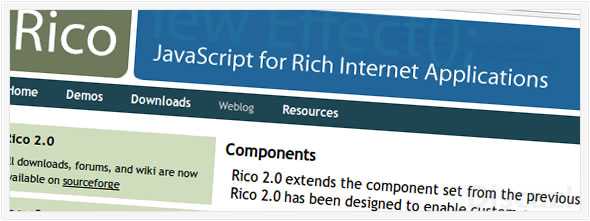 Rico是一個开源的,基于现有的 Prototype、jQuery、MooTools、Dojo 等的 Ajax 框架,Rico 在这些 Ajax 框架的基础上实现了常用的网页应用效果,例如拖放等等功能。Rico 目前版本为2.0。