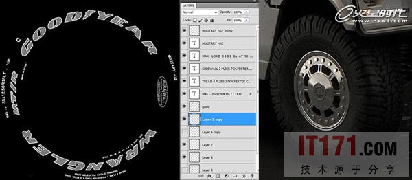 轮胎的商标首先在Photoshop中制作好,然后把这个凹凸贴图应用到轮胎上。(图08)