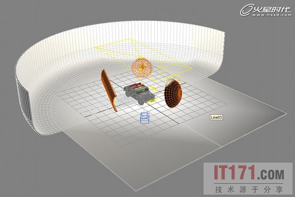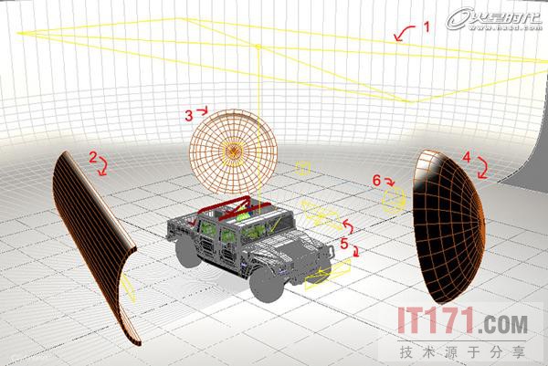 2、3、4号VRay灯通过3个球型物体进行反弹,主要是来创建柔和的光线。