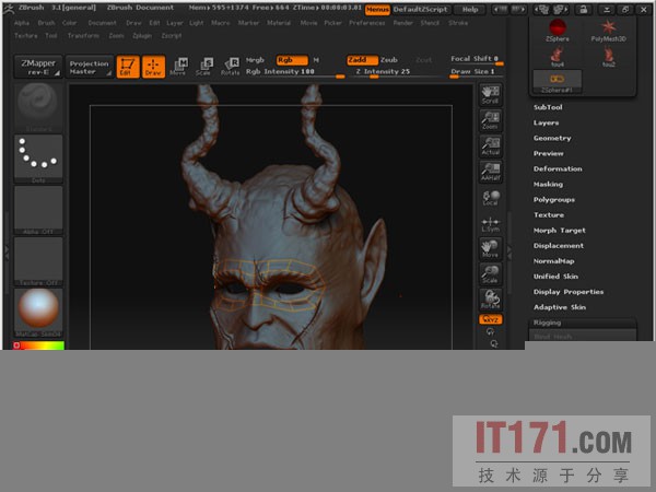 五、纹理的绘制 三分建模七分材质,可见材质的重要性。在制作前,我们要准备一些模型所具备图片素材,最好建一个文件夹。将所需要的素材放进去。比如这副作品主要需要:皮肤、金属、布等,打开自己的素材库,找到之前准备好的素材。在ps里面确定一个底色,这很重要,通过几种材质属性的图片以叠加的方式做到符合自己的要求,再导入zb里面,用standard和alpha通道、highlighterbrush等笔刷就可以得到你想要的效果,在这我推荐一个zb结合ps的插件zapplink。这样做能提高效果,同时也很方便整理。